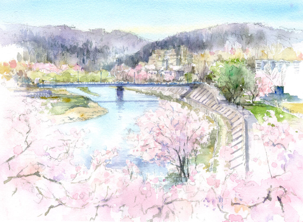 この作品『桜色と広瀬川』は、そんな“仙台の春の一瞬”を、水彩で静かにすくい取った一枚です。